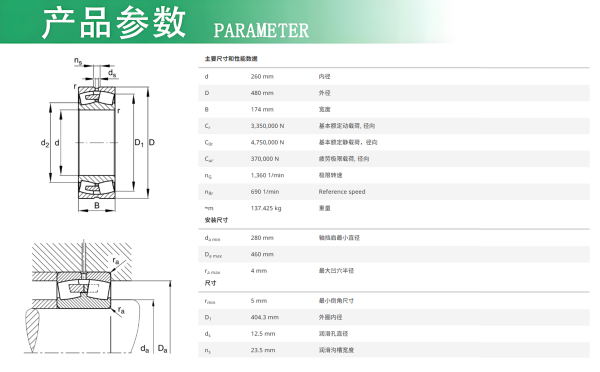 FAG調(diào)心滾子軸承23252-BEA-XL-MB1-C3 1、外圈內(nèi)球面滾道可起自動(dòng)調(diào)心作用; 2、可承載雙向軸向力和高徑向力,為適應(yīng)重載荷場(chǎng)合要求而設(shè)計(jì)的; 3、E1型為結(jié)構(gòu)增強(qiáng)型,內(nèi)圈上沒(méi)有中擋邊,可使?jié)L子更長(zhǎng),承受載荷更大; 4、XL:X-Life軸承具有更好運(yùn)動(dòng)學(xué)性能和優(yōu)化的滾到表面,并由高性能材料制成且不帶中擋邊。因此,在相同工作條件下,軸承的基本額定動(dòng)載荷和額定壽命顯著提高。