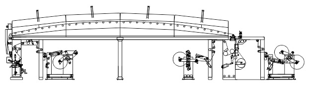 產品用途: 該機適用于BOPP、PET、PVC、PE、鋁箔、紙張等卷狀薄膜材料兩層多次復合,生產高強度,高保鮮、耐蒸煮等高品質包裝材料。產品特點: 1、整機PLC可編程控制器控制,運行穩(wěn)定、可靠。2、人機界面,10.4寸液晶觸摸屏。 3、進口矢量九電機同步控制。 4、網紋輥帶刮刀之涂布方式(備有多種涂布量的網紋輥供選擇)。 5、放卷翻轉雙工位機構,EPC自動糾偏系統(tǒng),自動裁切裝置可實現(xiàn)不停機接換卷。 (復合之前另設置有單工位鋁箔專用放料架) 6、收卷翻轉雙工位機構,預驅動功能,自動裁切裝置可實現(xiàn)不停機換卷。 7、移動式刮刀,氣動背壓裝置。 8、四段獨立烘箱結構,封閉循環(huán)式烘箱及獨立加熱送風系統(tǒng),自動恒控制。 9、氣頂式烘箱及穿膜操作平臺,烘箱內導輥主動同步運轉。 10、復合基材預熱裝置,復合成品水冷卻裝置。 11、氣脹式收放卷軸。 12、復合采用三輥壓合方式,壓力更均勻,復合更牢固。 穿膜圖: ![]() 技術參數(shù):