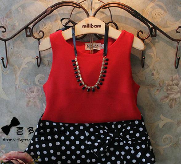 夏季歐洲站超洋氣女童亮色雪紡上衣+波點蝴蝶結(jié)短裙套裝一件代發(fā)